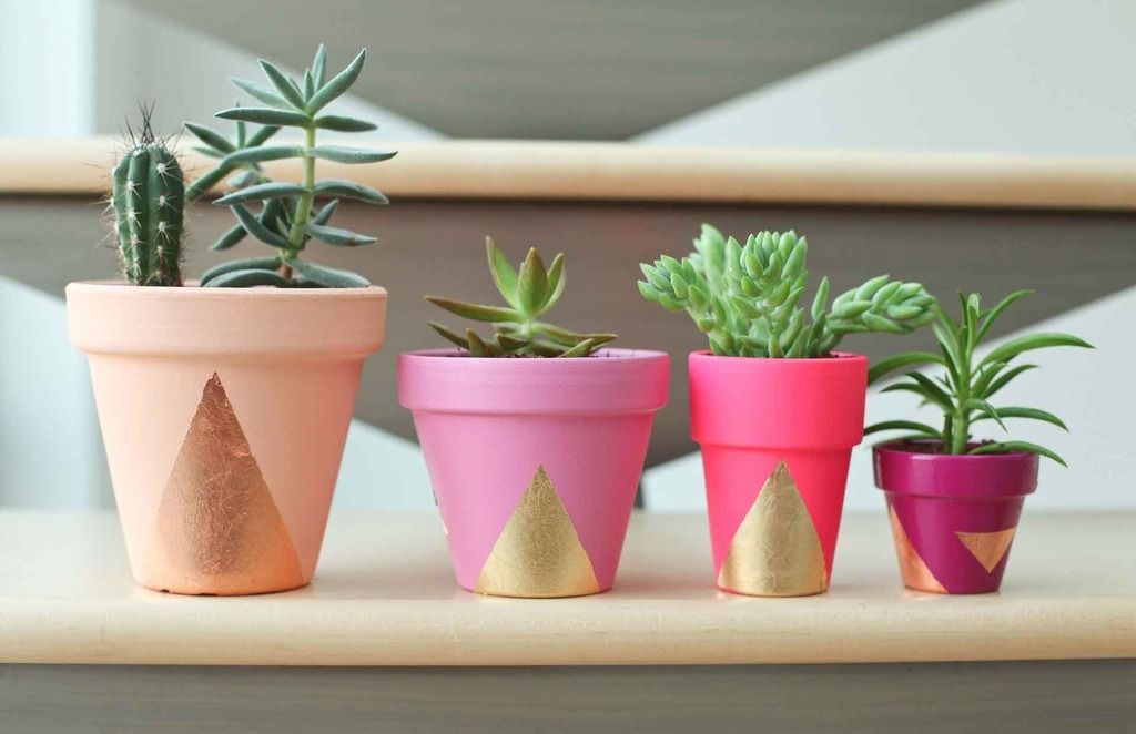 Estes vasos de diversos tamanhos, em terracota, foram pintados com spray em diferentes tons de rosa e, por fim, aplicada folha dourada. Fácil de fazer e transformam logo qualquer lugar.