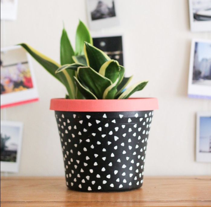 Na segunda foto temos um vaso de plástico pintado com duas cores diferentes e as formas brancas feitas com aquela borracha que vem em alguns lápis. Simples, não?