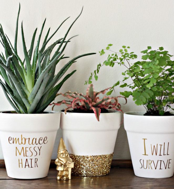 E por que não vasos decorados com glitter e frases divertidas? As frases podem ser escritas à mão ou então utilizar papel autocolante.E porque a personalização não se faz só com tintas e spray, temos vasos forrados com tecido. Basta escolher o tecido, usar um pouco de cola e voilá!